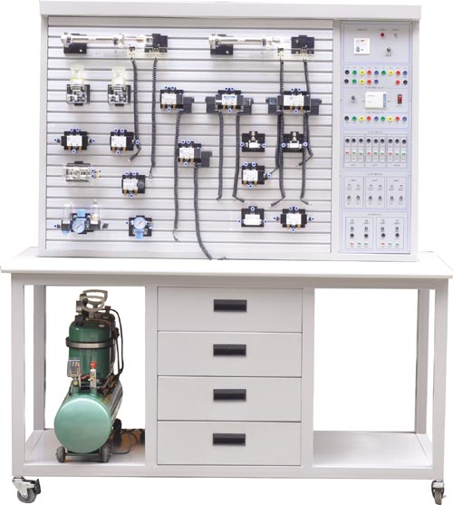 氣動(dòng)PLC控制實(shí)驗(yàn)臺(tái)主要由實(shí)驗(yàn)桌及實(shí)驗(yàn)支架、氣動(dòng)元器件、電氣控制器件等組成。
